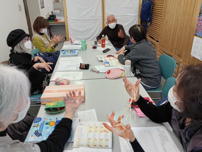 和気藹々の中で新しいあやとりを練習 |