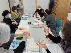 最近は、具体的な受験計画は無いが「あやとりとり検定問題」を完全にマスターしようと皆で練習している。今回は連続あやとりに挑戦している風景の一部。中には2名ほどいずれ受験したいという気持ちを持っている会員もいて全員熱心に取り組んでいる。先日は宮崎市立図書館主催のあやとりボランティアに会員4名が出席して集まった子供たち20名ほどに初歩的なあやとりを教えた。 |